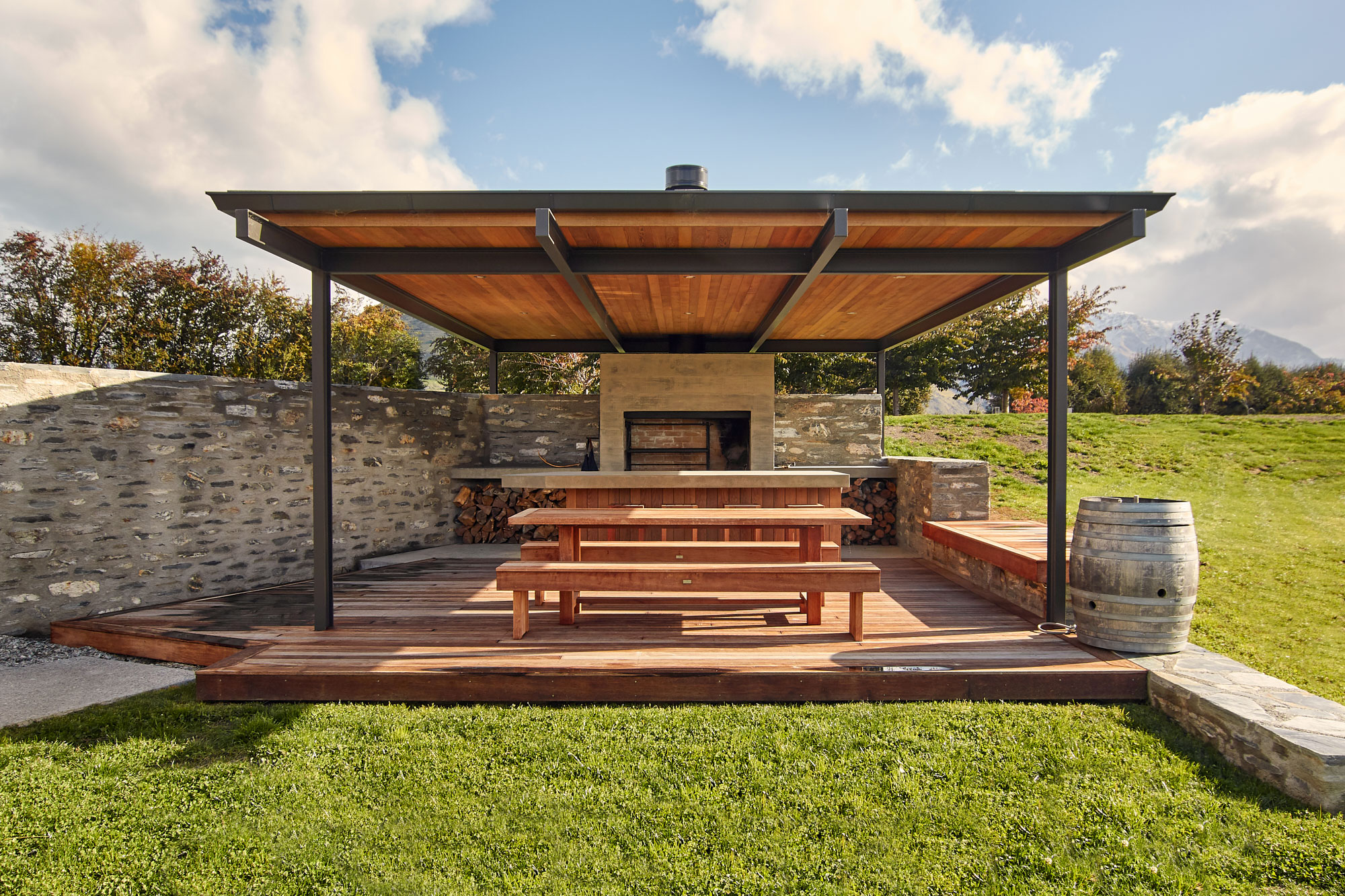 With their considered design, north-facing louvres allow for air circulation in summer. Come winter, a wood-burning fireplace is a fitting choice for a home that will be dusted in snow. A loft can be found upstairs. The quincho-style pavilion and wraparound deck mean there is ample space for outdoor seating and dining, well sheltered from the elements. Schist stonework and timber edging on the exterior were completed by family, infusing this home with a supremely personal touch.